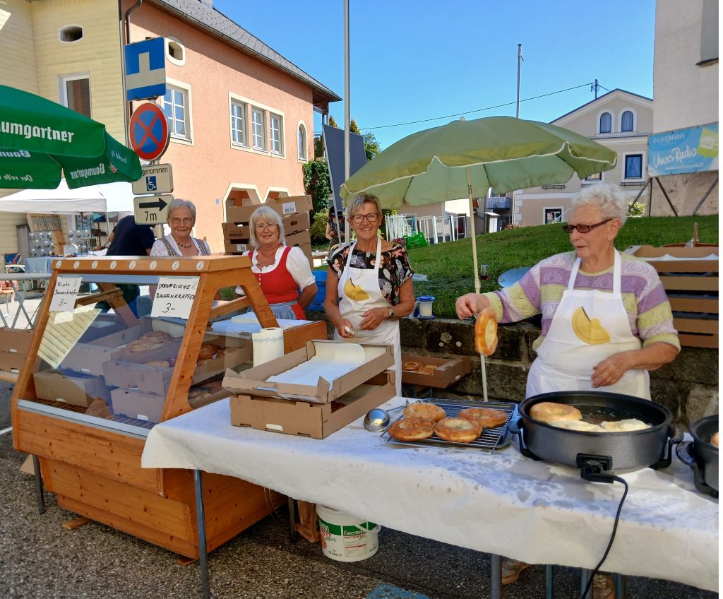 Lembacher Goldhaubenfrauen backen Bauernkrapfen beim Markttag.