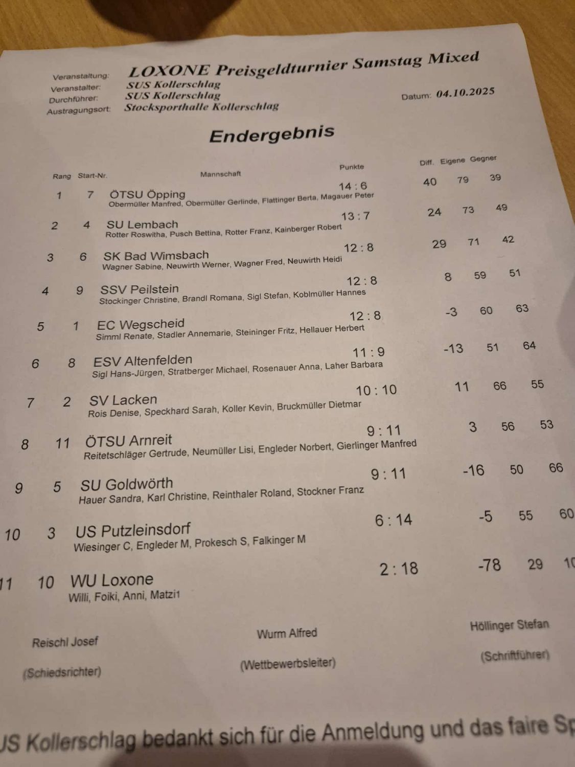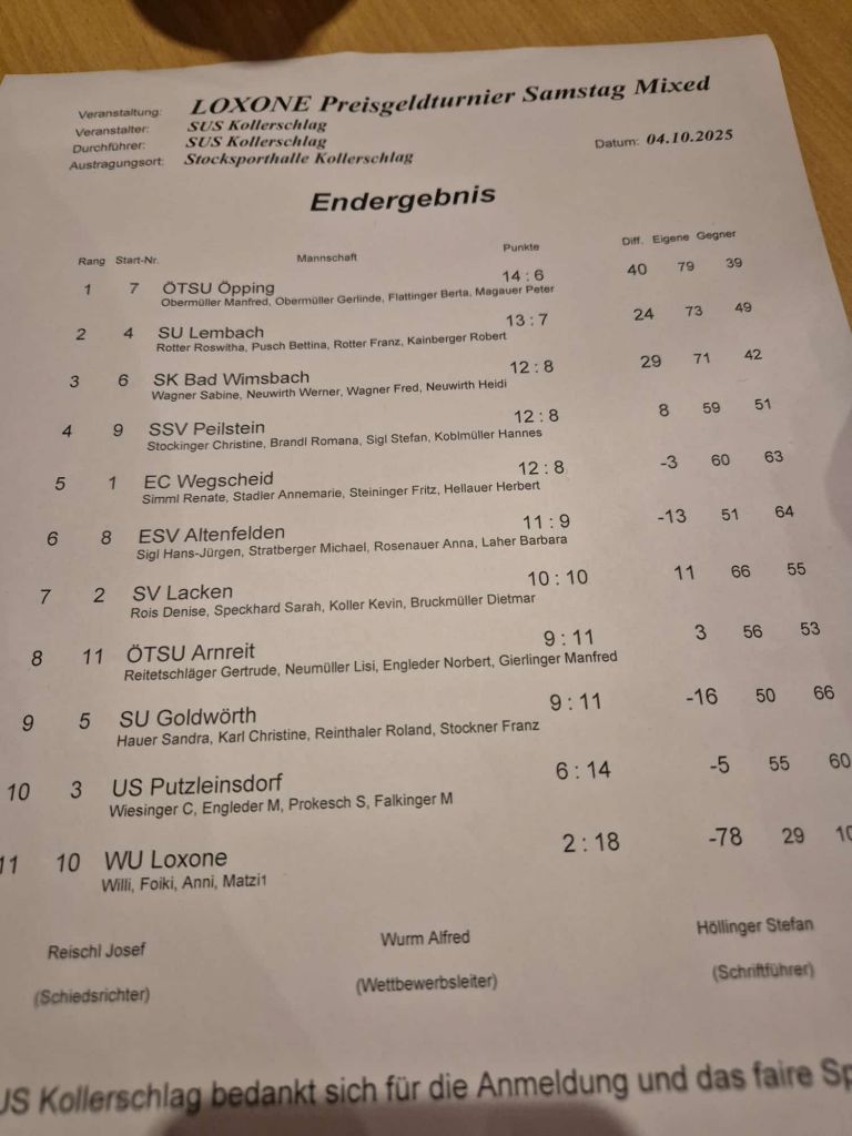 Am 04.10.2025 holte unsere Mannschaft (Franz Rotter, Roswitha Rotter, Robert Kainberger, Bettina Pusch) den zweiten Platz beim LOXONE Preisgeldturnier Mixed der SUS Kollerschlag in der Stocksporthalle Kollerschlag. Herzliche Gratulation!