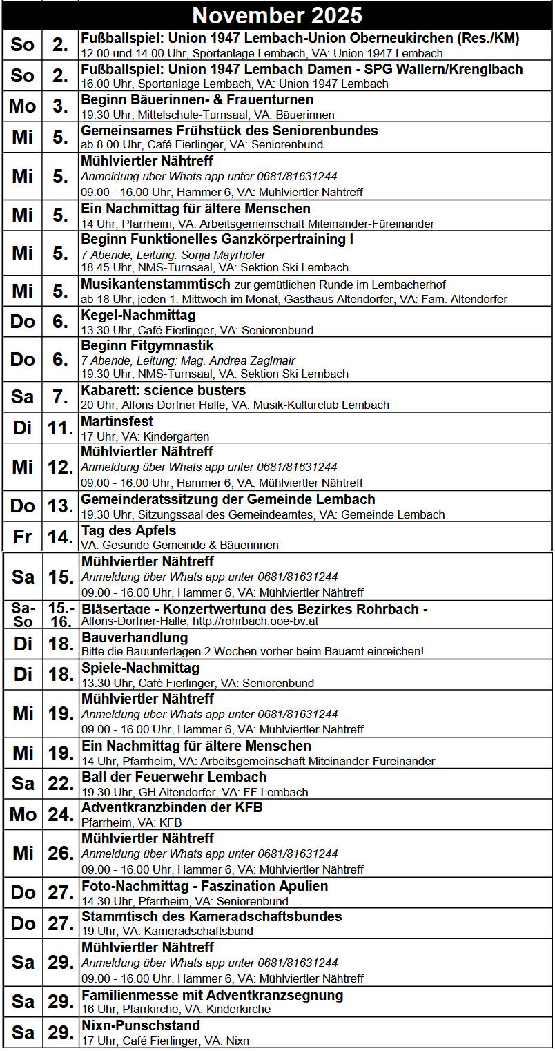Aktuelle Veranstaltungen in Lembach (Aktueller Stand Kalenderblatt 2.11.2025)