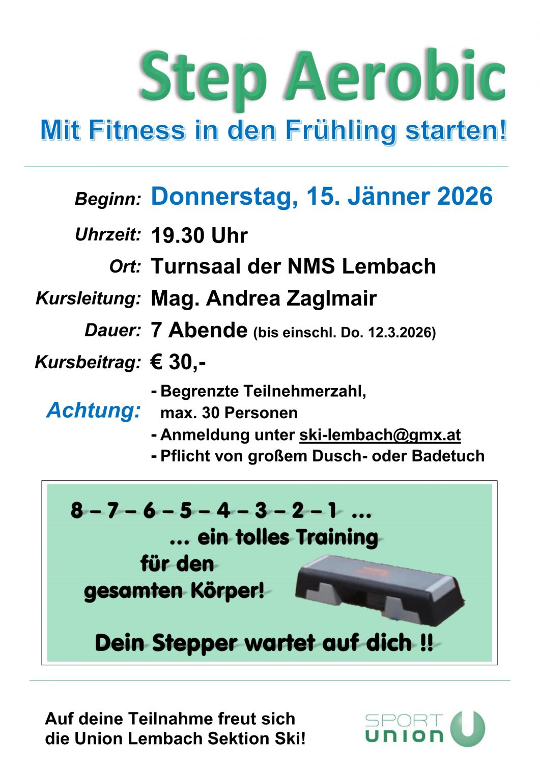 Am Donnerstag, 15. Jänner 2026 starten wir unseren Step Aerobic-Kurs.