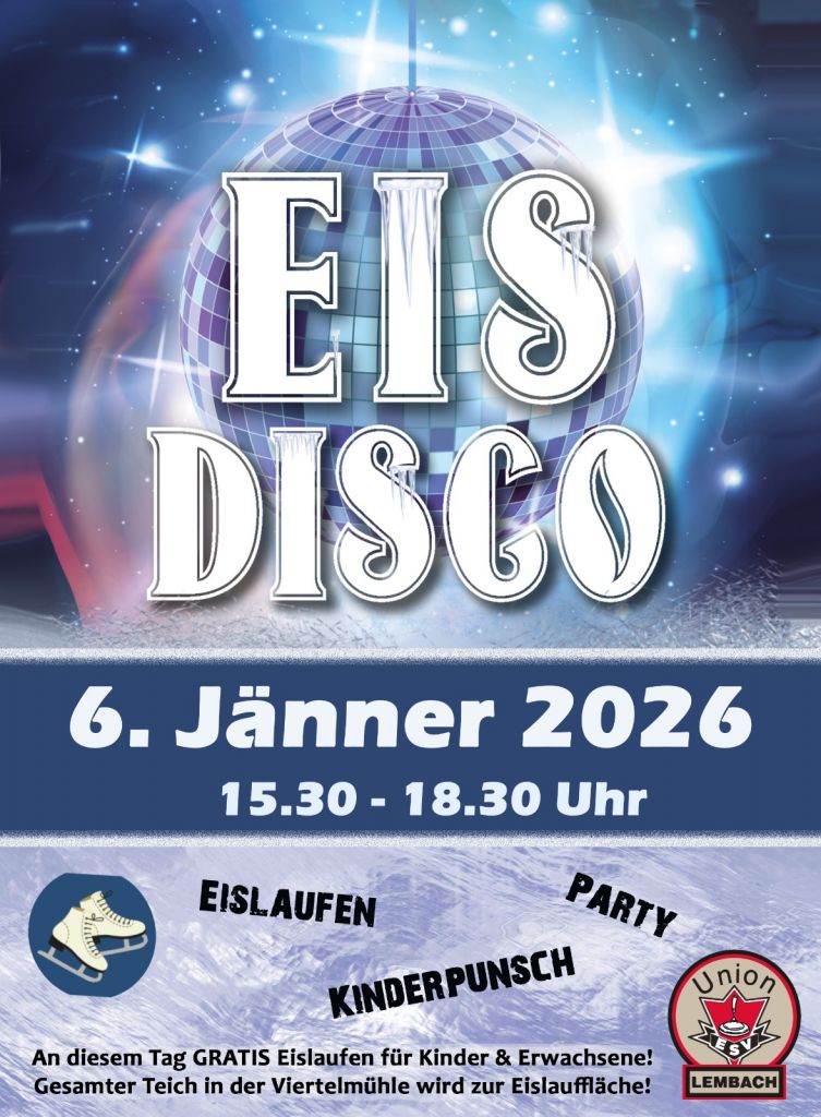 Eisdisco am 06.01.2026 von 15:30 bis 18:30 Uhr auf der Eisbahn Viertelmühle.