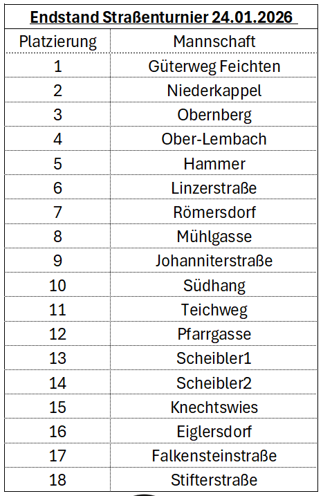 Am 24.01.2026 ging das Straßenturnier der Saison 2026 über die Bühne. Geschossen wurde in 2 Gruppen auf je 4 Bahnen Wildschießen. Anschließend wurden noch die Platzierungsspiele zwischen den Mannschaften beider Gruppen ausgeschossen. Aus 18 teilnehmenden Mannschaften ergab sich folgende Platzierung: