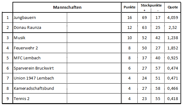 Am 10.01.2026 ging das Vereinsturnier der Saison 2026 über die Bühne. Geschossen wurde in 2 Gruppen auf je 4 Bahnen Wildschießen mit insgesamt 18 Mannschaften. Aufgrund des nicht so optimalen Wetters wurden keine Platzierungsspiele.
