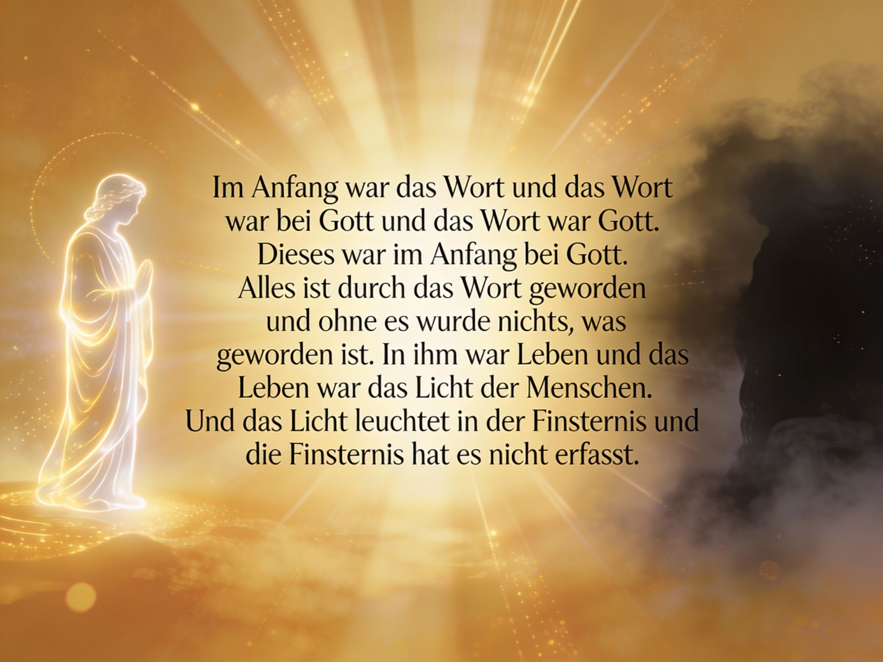 Im Anfang war das Wort und das Wort war bei Gott und das Wort war Gott. Dieses war im Anfang bei Gott. Alles ist durch das Wort geworden und ohne es wurde nichts, was geworden ist. In ihm war Leben und das Leben war das Licht der Menschen. Und das Licht leuchtet in der Finsternis und die Finsternis hat es nicht erfasst. Das wahre Licht, das jeden Menschen erleuchtet, kam in die Welt. Er war in der Welt und die Welt ist durch ihn geworden, aber die Welt erkannte ihn nicht. Er kam in sein Eigentum, aber die Seinen nahmen ihn nicht auf. Allen aber, die ihn aufnahmen, gab er Macht, Kinder Gottes zu werden, allen, die an seinen Namen glauben, die nicht aus dem Blut, nicht aus dem Willen des Fleisches, nicht aus dem Willen des Mannes, sondern aus Gott geboren sind. Und das Wort ist Fleisch geworden und hat unter uns gewohnt und wir haben seine Herrlichkeit geschaut, die Herrlichkeit des einzigen Sohnes vom Vater, voll Gnade und Wahrheit.