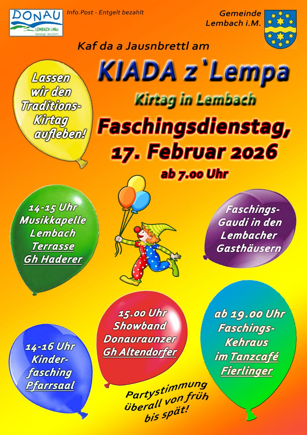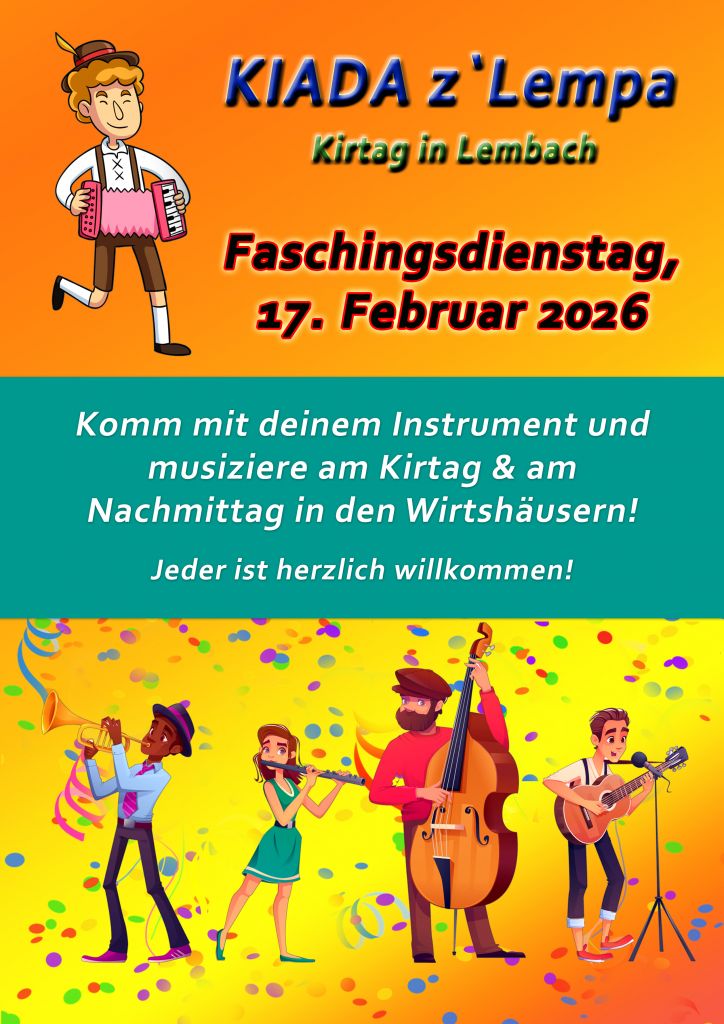 Der Faschingsdienstag in Lembach hat schon jahrelange Tradition. Bereits ab 7.00 findet der Kirtag am Marktplatz statt und den ganzen Vormittag gibt’s in div. Geschäften, Bankstellen, Trafik, Gemeindeamt etc. viel Spaß.