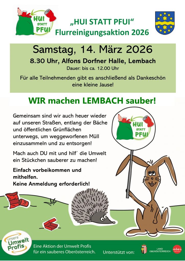 In der Gemeinde Lembach wird am Samstag, den 14. März 2026 wieder die alljährliche Flurreinigungsaktion durchgeführt.