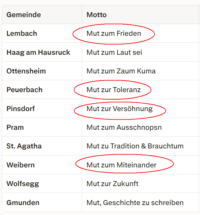 Andere „Bauernkriegs“-Gemeinden in O.Ö. benennen in ihrer Kommunikations-Strategie ähnliche Schwerpunkte. Vier Gemeinden haben angesichts des letztlich doch sehr kriegerischen Themas eine besonders gute Auswahl getroffen. Denn