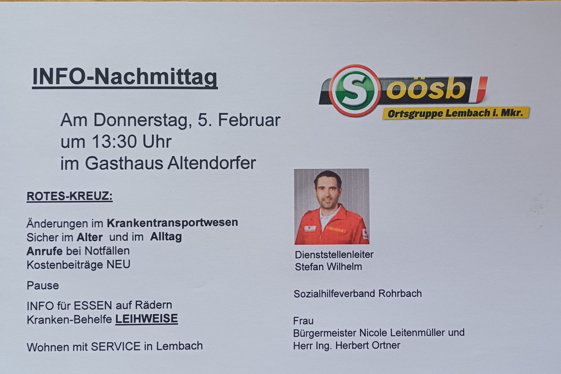 Der Seniorenbund Lembach veranstaltet am Donnerstag, den 5. Februar 2026 um 13:30 Uhr im Gasthaus Altendorfer einen Info-Nachmittag , zum Thema sicherer ALLTAG im ALTER. Alle Interessierten sind dazu herzlich eingeladen.