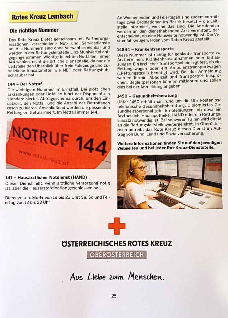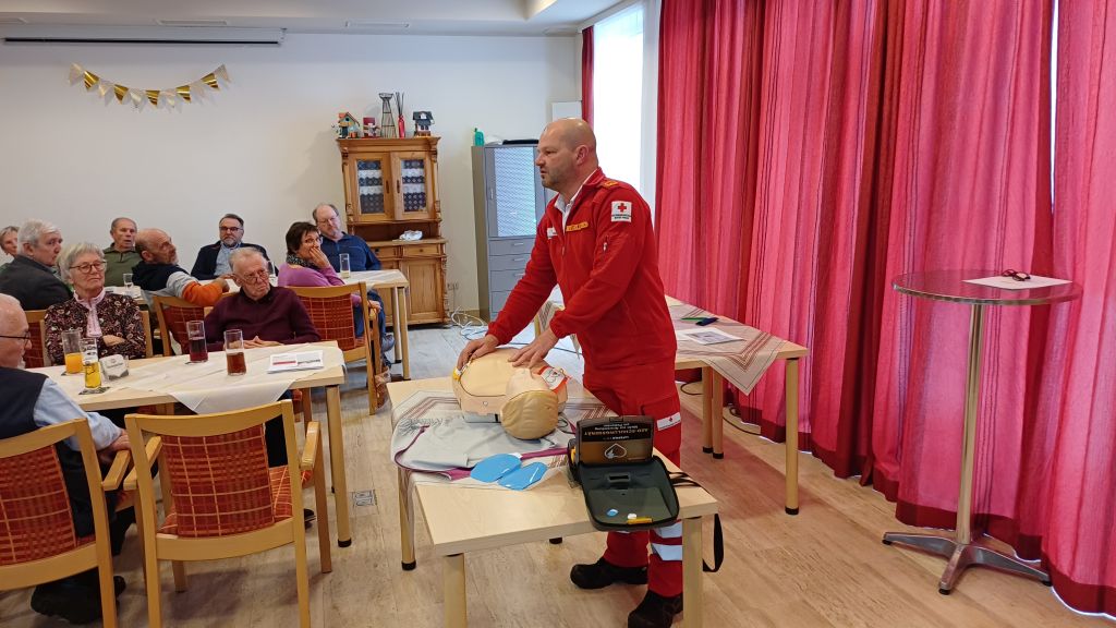 Herr Christoph HOLLNSTEINER vom Roten Kreuz, Ortsstelle Lembach erklärte anschaulich den richtigen Umgang mit Notrufnummern. In Notfällen – aber auch bei anderen dringenden Anliegen – sollte immer die Notrufnummer gewählt werden, da man direkt in der Einsatzleitstelle landet, wo bestens geschultes Personal den Überblick über Einsatzfahrzeuge und Einsatzorte hat. Zusätzlich stellte er die Standorte der Defibrillatoren in Lembach vor und demonstrierte deren Anwendung an einer Übungspuppe. Informationen zum neuen Krankentransportwesen rundeten seinen Vortrag ab, da seit Juli 2025 bei geplanten Fahrten von der ÖGK eine Rezeptgebühr verrechnet wird.