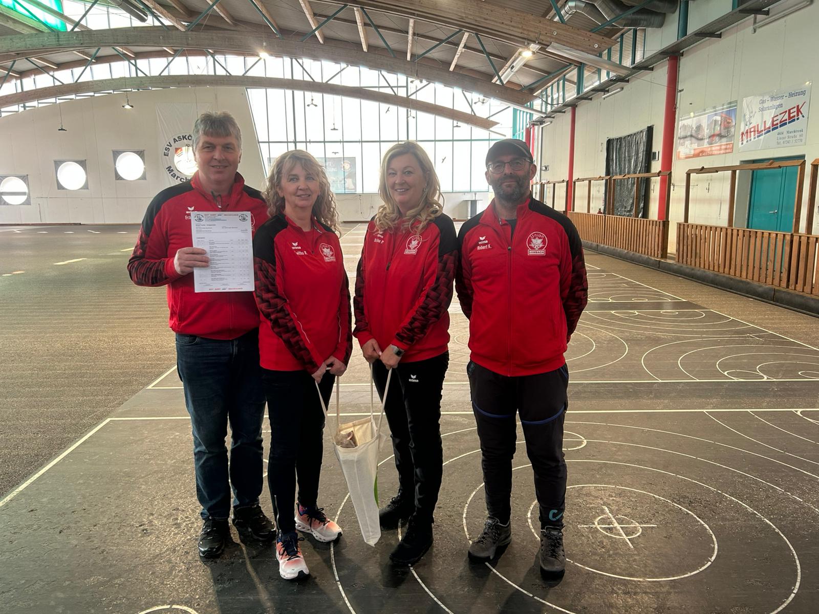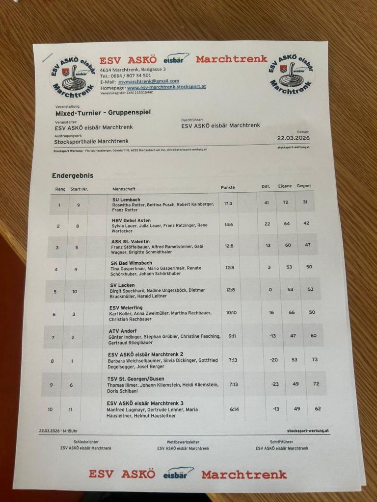 Am 22.03.2026 holte unsere Mannschaft (Franz Rotter, Roswitha Rotter, Bettina Pusch, Robert Kainberger) den ersten Platz beim Mixed Turnier des ESV ASKÖ eisbär Marchtrenk in der Stocksporthalle Marchtrenk. Herzliche Gratulation!