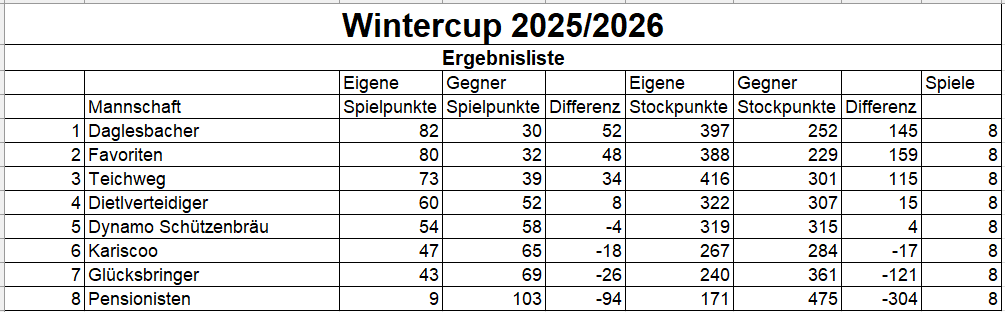 Der Wintercup 2025/2026 wurde am 10.04.2026 in der Stockhalle Putzleinsdorf in Form eines Turnieres mit 9 Mannschaften beendet. Den Tagessieg holte sich das Team Dietlverteidiger mit 14:0 Punkten. Anschließend wurde der Abschluss gemütlich in der Eishütte gefeiert. Wir bedanken uns bei allen Mannschaften für die Teilnahme.