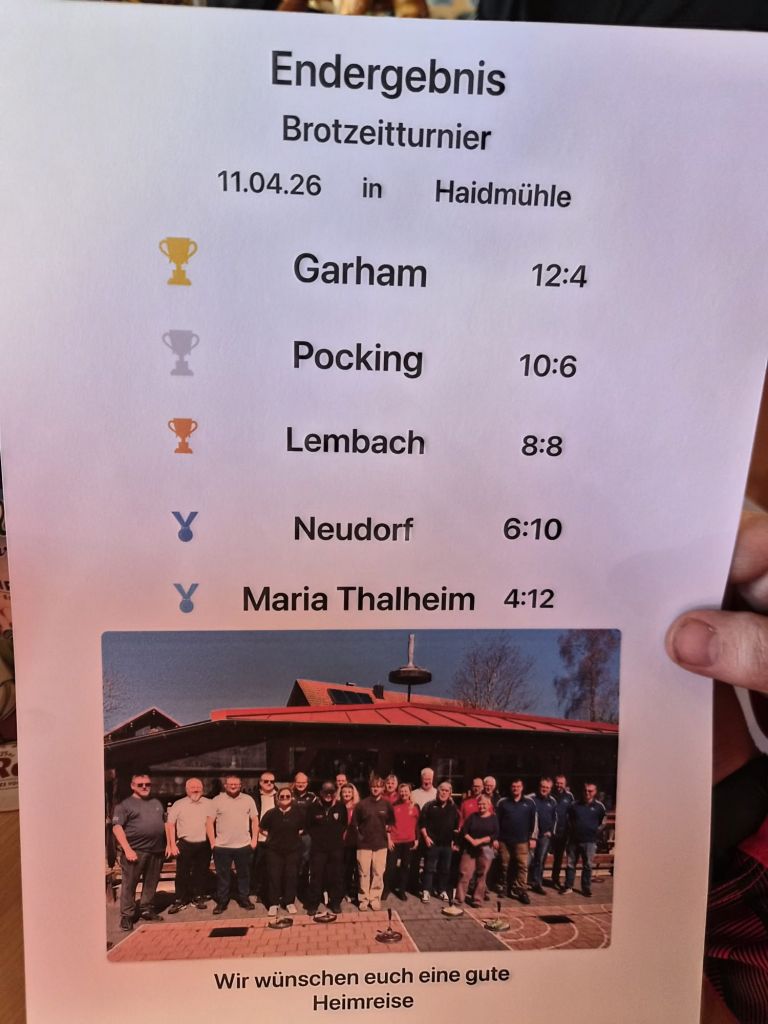 Am 11.04.2026 holte unsere Mannschaft (Franz Rotter, Roswitha Rotter, Bettina Pusch, Bernhard Löffler) den dritten Platz beim Brotzeitturnier in der Haidmühle. Herzliche Gratulation!