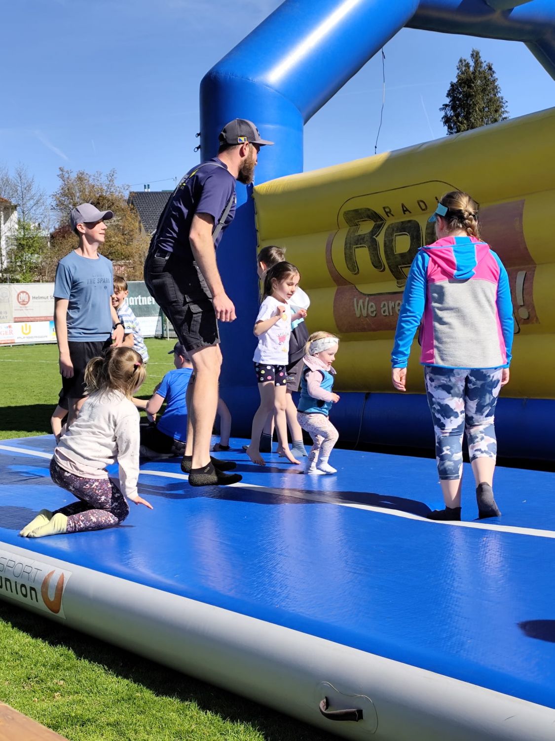Während die Erwachsenen einen ruhigen Nachmittag bei Kuchen und Kaffee und diversen anderen Getränken genießen konnten, nutzen die Kinder den Nachmittag am Sportplatz zum Auspowern bei den verschiedenen Stationen. So waren die Hüpfburg, die Airtrack-Matte, die Cornhole-Boards und die Riesenzielscheibe dauerhaft im Betrieb. Bei der Malstation konnten die Kinder zur Ruhe kommen und Steine, sowie Ausmalbilder bemalen.